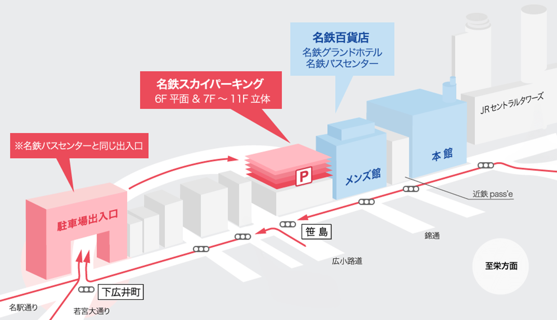 名鉄百貨店直結、名鉄スカイパーキングのご利用が便利です。