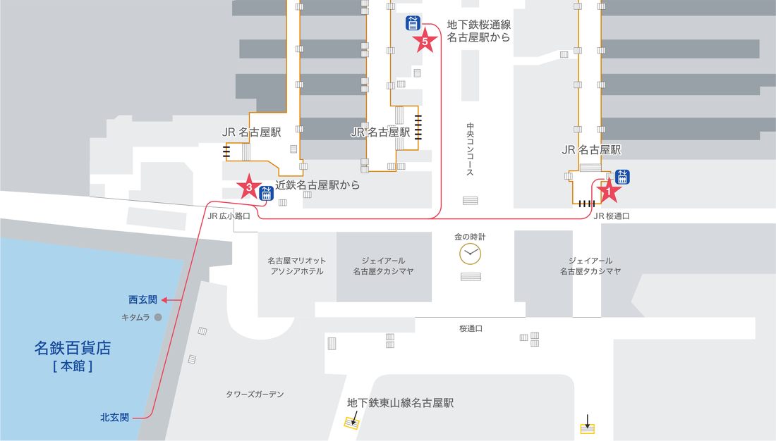 | 名古屋市営地下鉄 | 東山線「名古屋駅」下車 桜通線「名古屋駅」下車 |