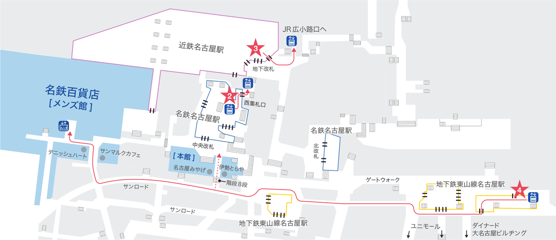 - JR桜通口の改札を出て、右手に進むと広小路口があります。 広小路口から外に出てまっすぐ進むと、右手前方に名鉄百貨店があります。