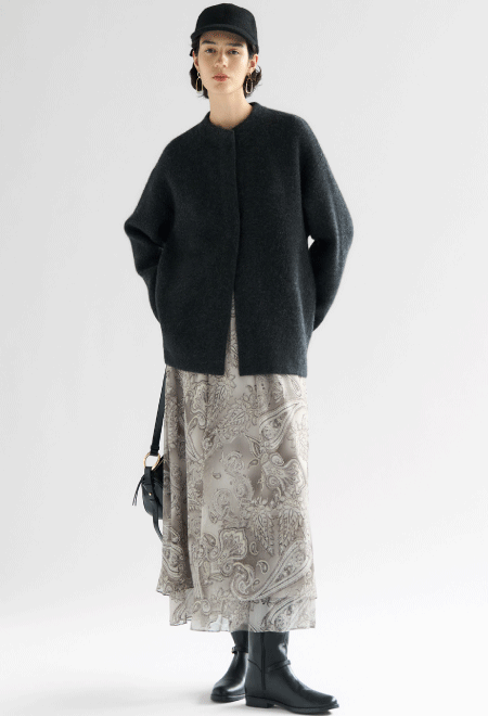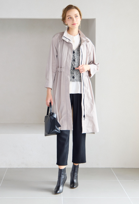 首に沿うような上品な襟元で、ややコクーンシルエットになっています。