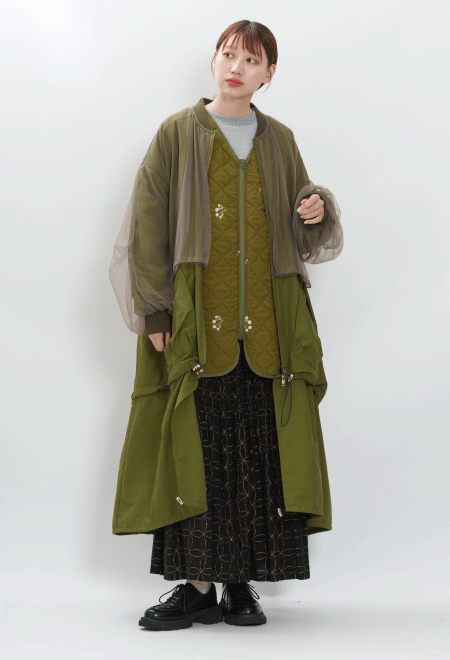 たっぷりシルエットにチュール生地を組み合わせた、カジュアル×フェミニンスタイリングが叶うコートは、着丈が変化する優秀な1着です。
