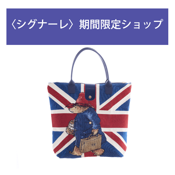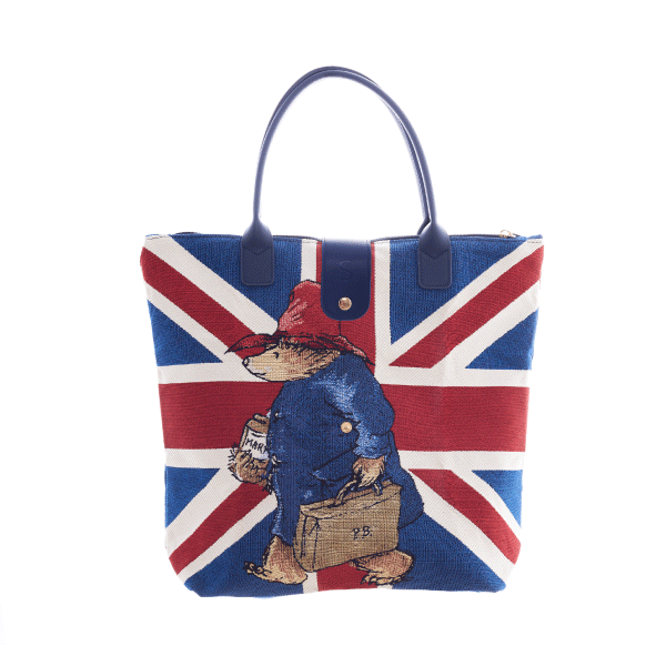 ユニオンジャックとパディントンベアのミックスデザインが印象的な折りたたみ式エコバッグです。