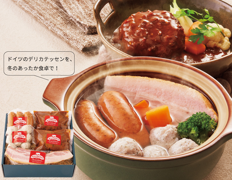 本場ドイツの食肉マイスター直伝の技を受け継いだ〈クリンゲン〉から、ポトフに最適な、コロコロとした太いソーセージと旨味の強いベーコンブロック・南ドイツ風のソーセージ団子を冬限定のセットに。