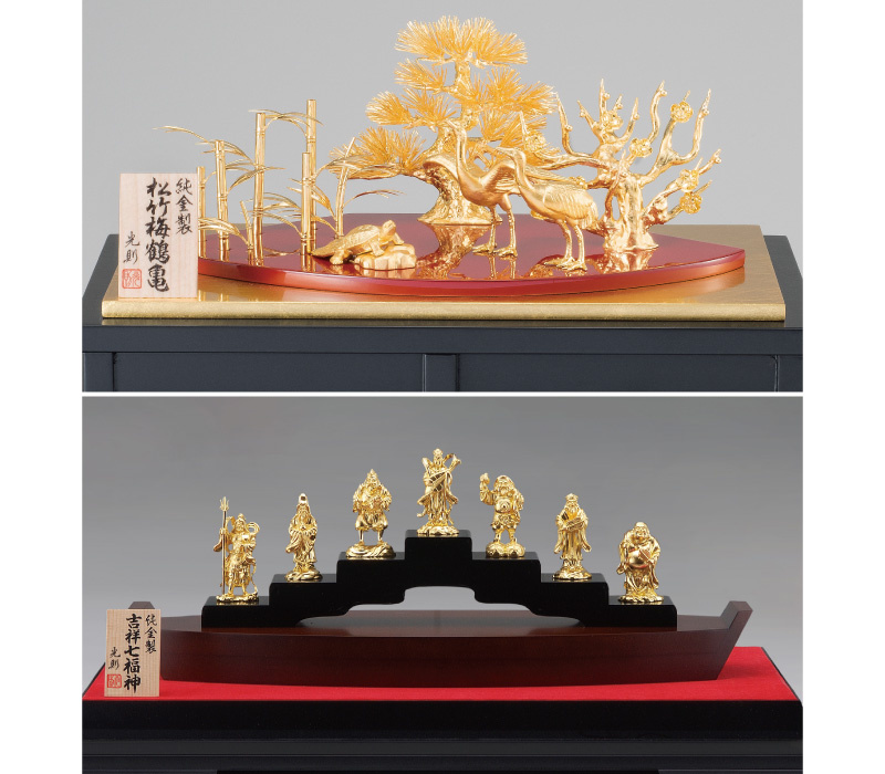 ●「松竹梅」・「鶴亀」・「七福神」 という縁起の良いモチーフを、 2台の置物に集めた、新春にふさわしい金製品の福袋。