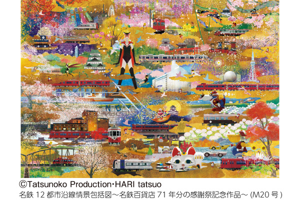 名鉄百貨店開店70周年企画でも好評を博した、画家「はりたつお」氏による「名鉄沿線風景画」。今回は沿線12都市の風景を、1枚に描きお下ろしました。