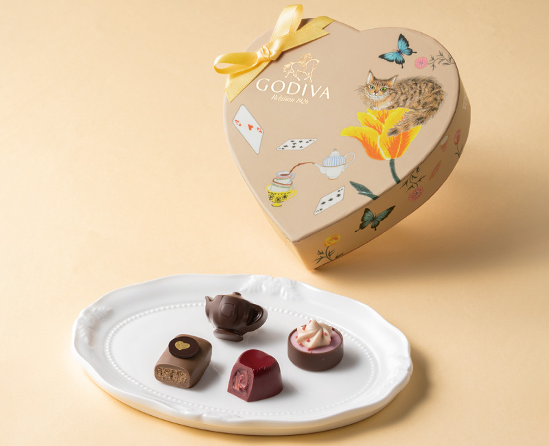「不思議の国のアリス」の印象的なシーン「ティーパーティ」をイメージしたチョコレートを楽しめる、キュートな「アリスのティーパーティ コレクション」。 ティーパーティを彩る紅茶やカップケーキなどをイメージした限定チョコレートを、物語のシンボルのトランプやティーセット、いたずら好きなチェシャ猫を描いたハート形のパッケージに詰め合わせました。