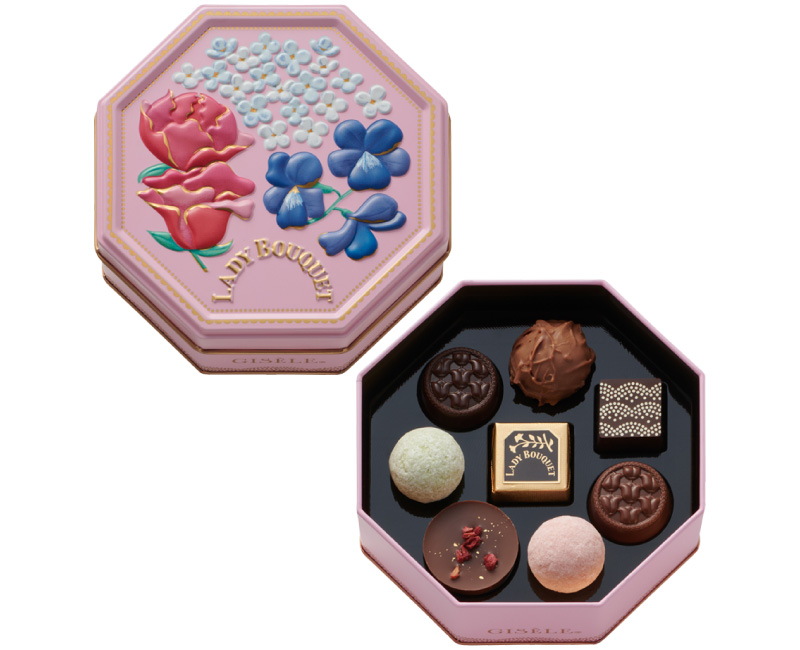印象的なパッケージデザインに、フラワーカクテルトリュフなど、フラワーモチーフのチョコレートで喜び溢れる花々を表現しました。花束をイメージしたフェミニンな缶入りチョコレートアソートメント。
