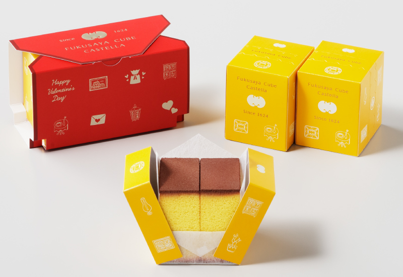 人気のフクサヤキューブ2箱を入れた、バレンタイン期間限定のギフトセットです。ハートやレターなどキュートなモチーフで飾られた赤いパッケージは、プチギフトにぴったりなバレンタイン時期限定の販売です。