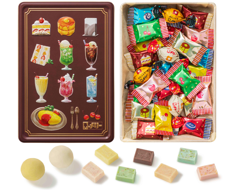 全種類のはじけるキャンディインチョコレートを、喫茶店のメニューをイメージした缶に集めました。