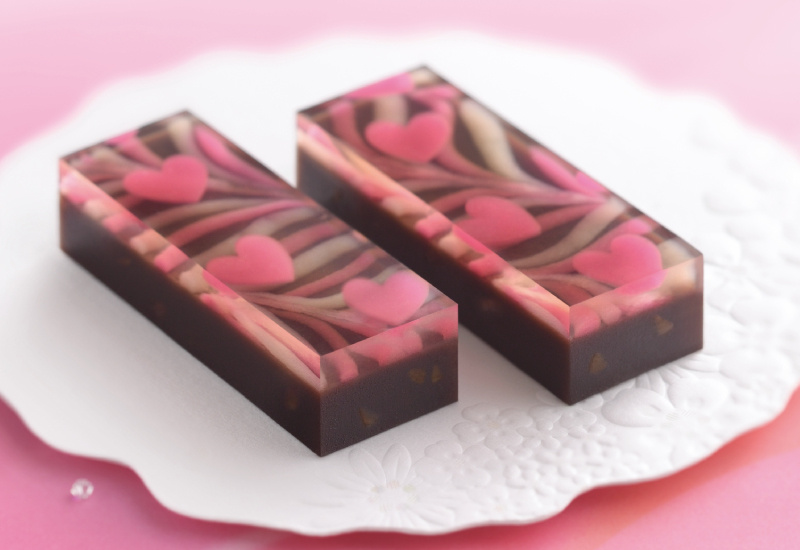オレンジピール香るチョコレート羊羹に、小さなハートが浮かぶ錦玉羹を合わせました。白とピンクの羊羹で描くマーブル模様も可愛らしい、バレンタイン限定のささらがたです。